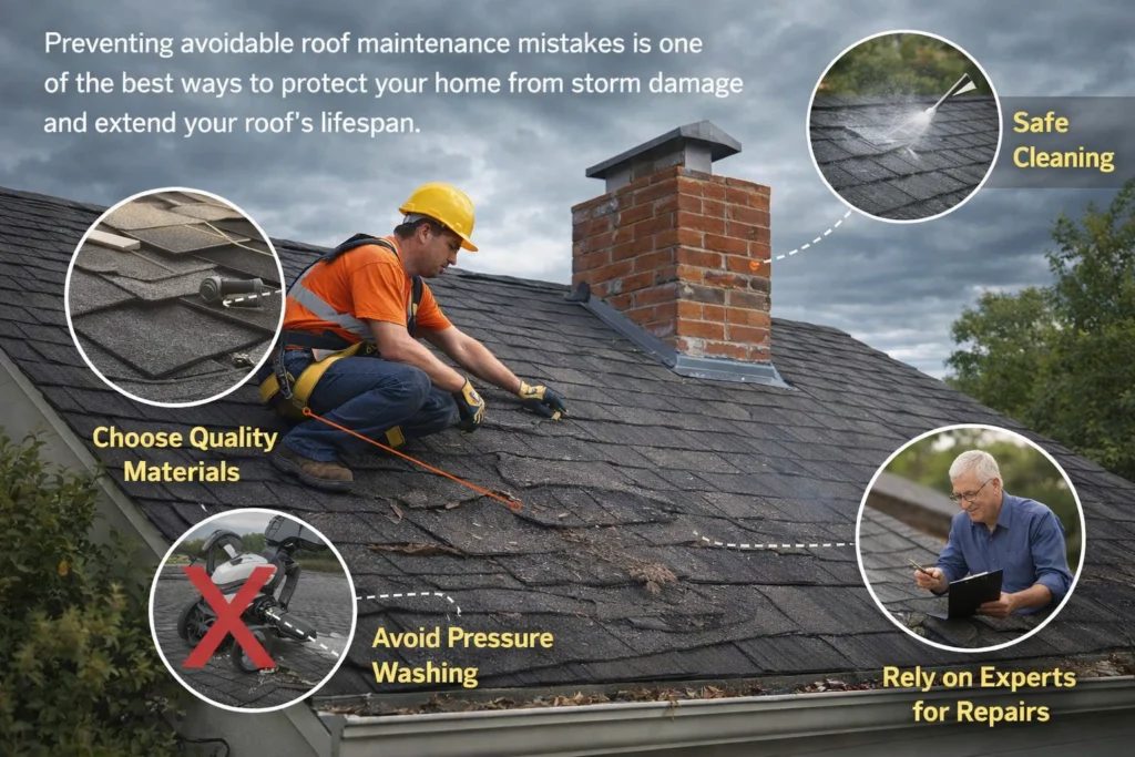 Every homeowner wants their roof to last as long as possible, yet many unknowingly take actions that increase the risk of storm damage. From using wrong cleaning methods on the roof to choosing materials that don’t match your roof type, simple mistakes can lead to expensive repairs. Understanding the basics of proper roof care is key to better home protection.
