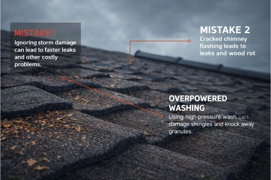 Pressure washing may look effective, but roof maintenance mistakes like using high-pressure spray can cause irreversible shingle loss and expose underlayment materials to moisture. This significantly increases the risk of storm damage and reduces home protection. Safer alternative: